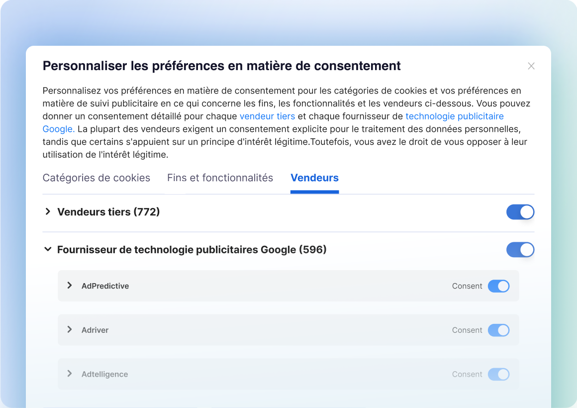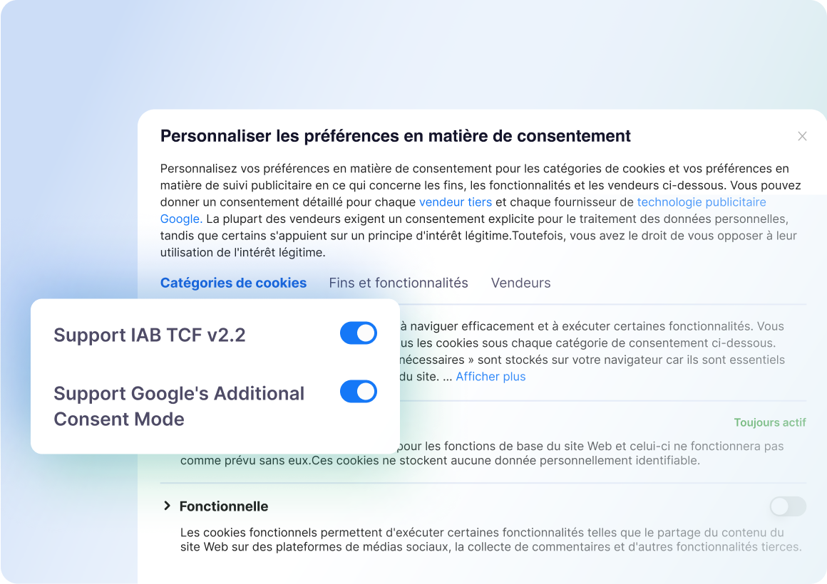 Intégrez les fournisseurs de l’IAB et prenez également en charge le mode de consentement de Google pour offrir aux utilisateurs un meilleur contrôle sur la façon dont leurs données personnelles sont traitées par les réseaux de technologie publicitaire.