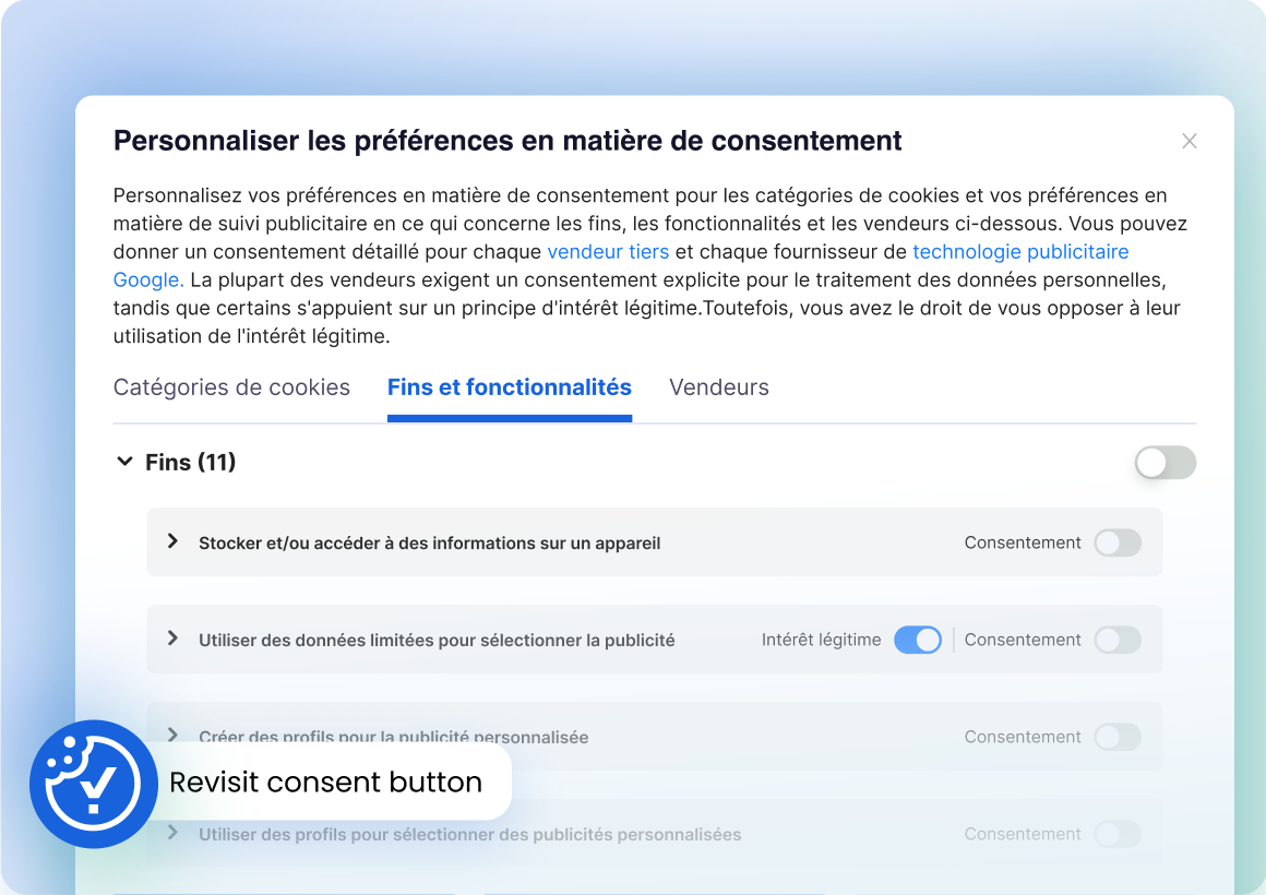 Accédez à une cookie banner TCF v2.2, pré-construite et approuvée par l’IAB, que vous pouvez activer d’un simple clic sur un bouton, sans effort manuel.