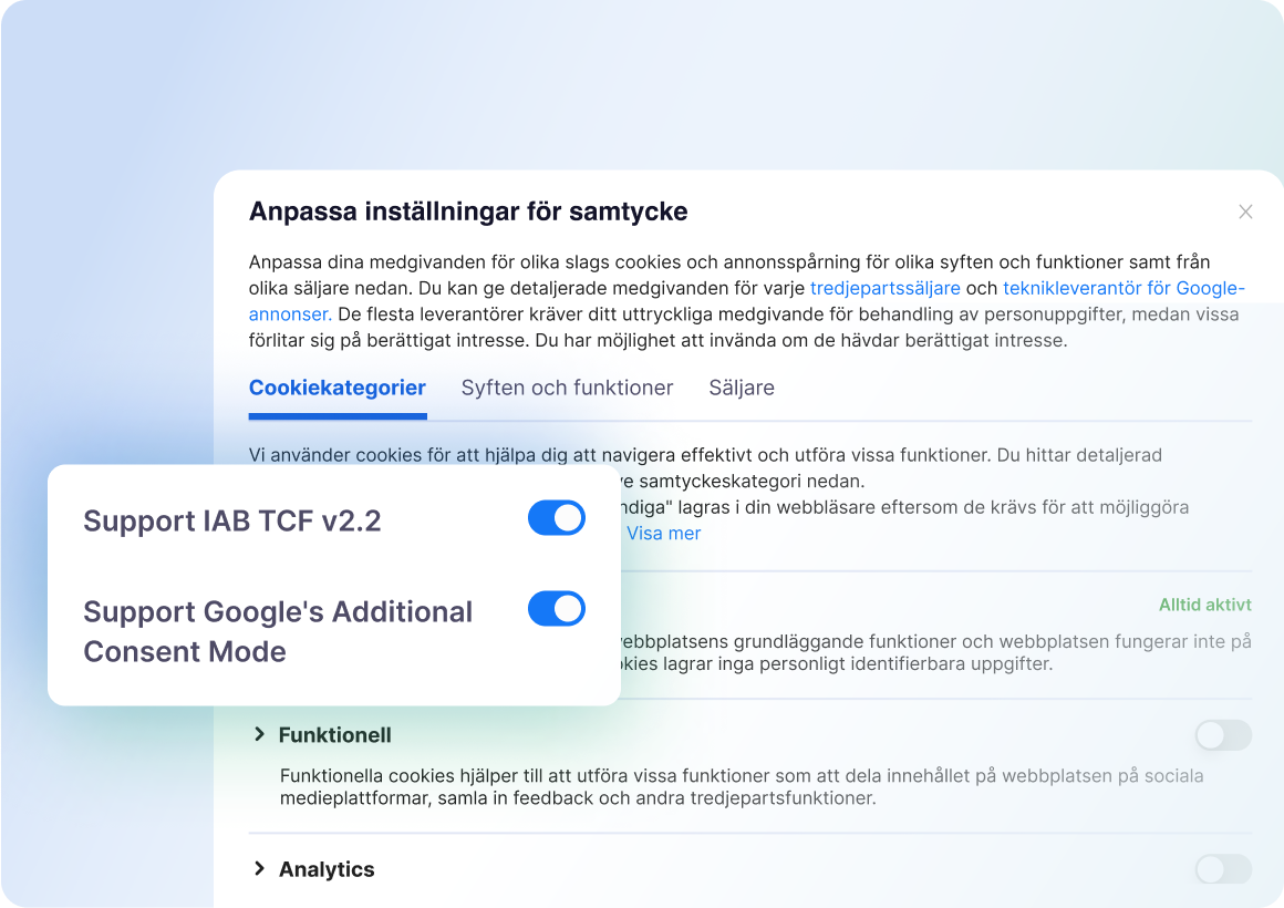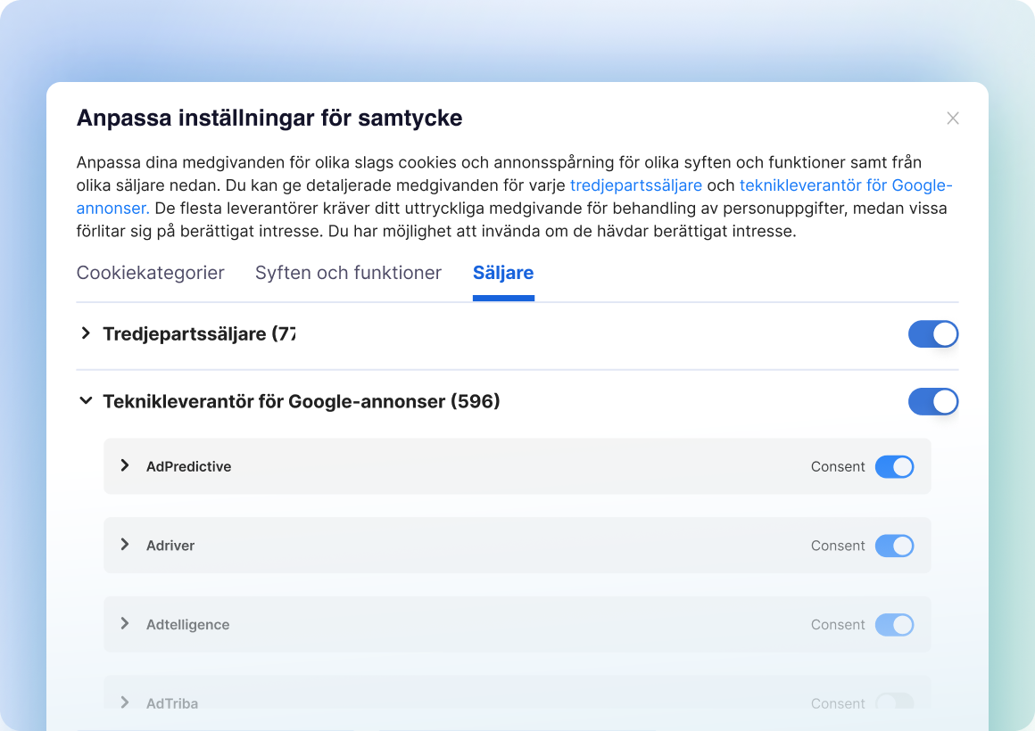 Integrera med IAB-leverantörer och stöd Googles Additional Consent Mode så att användarna får större kontroll över hur deras personuppgifter behandlas i annonstekniknätverket.