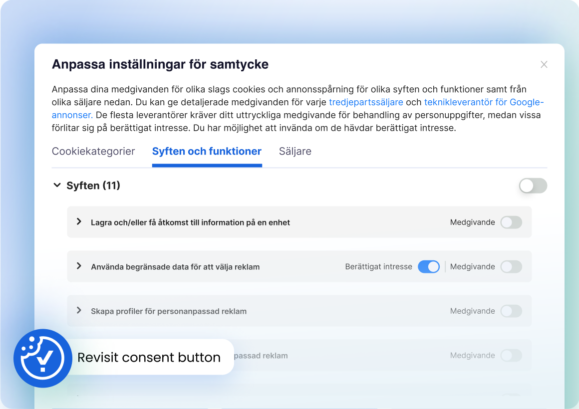 - Detaljerad leverantörsupplysningar med kategorier av uppgifter som samlats in, lagringsperioder och om ett berättigat intresse föreligger.