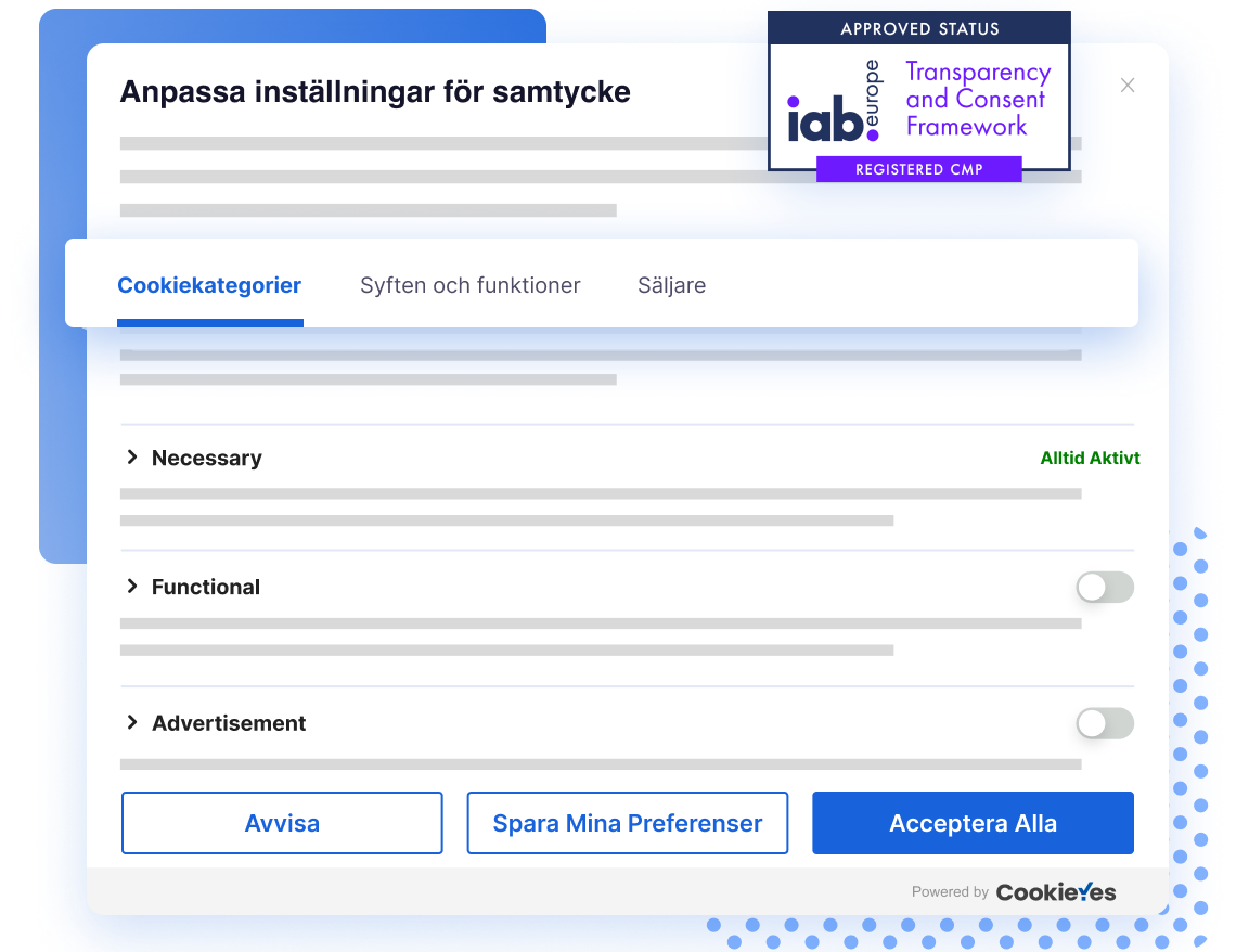 En plattform för samtyckeshantering (Consent Management Platform – CMP) som CookieYes är ett verktyg som hjälper webbplatsägare eller publicister att samla in, lagra och hantera användarnas samtycke för databehandling. CMP:er hjälper till att säkerställa efterlevnad av GDPR och IAB TCF genom att ge användarna möjlighet att ge, vägra eller återkalla samtycke till datainsamling och databehandling.