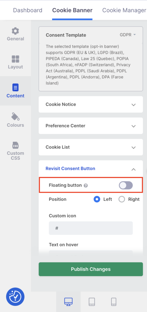 Lastly, make it easy for users to revisit their cookie choices or withdraw consent. Enable the Revisit Consent Button on your CookieYes dashboard to display a cookie preference widget where users can quickly review and update their consent settings.