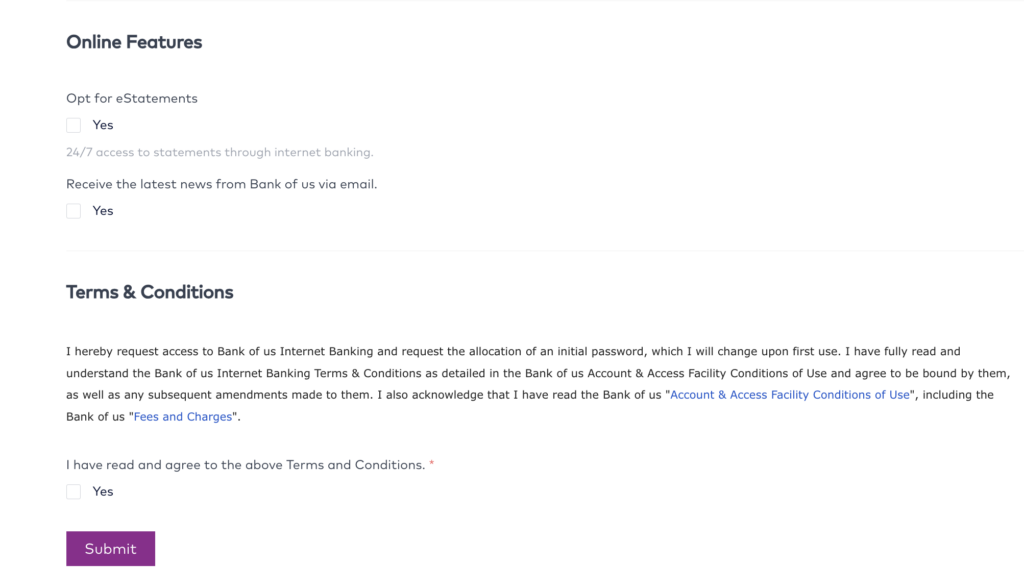 Similarly, the Bank of US asks you to accept the Terms and Conditions before registering for its internet banking services.