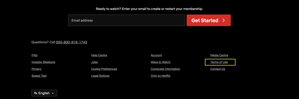 Netflix links its Terms of Use in the footer of its website.