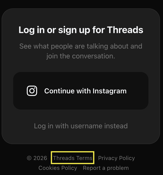 Threads links its terms on the login panel (see the bottom).