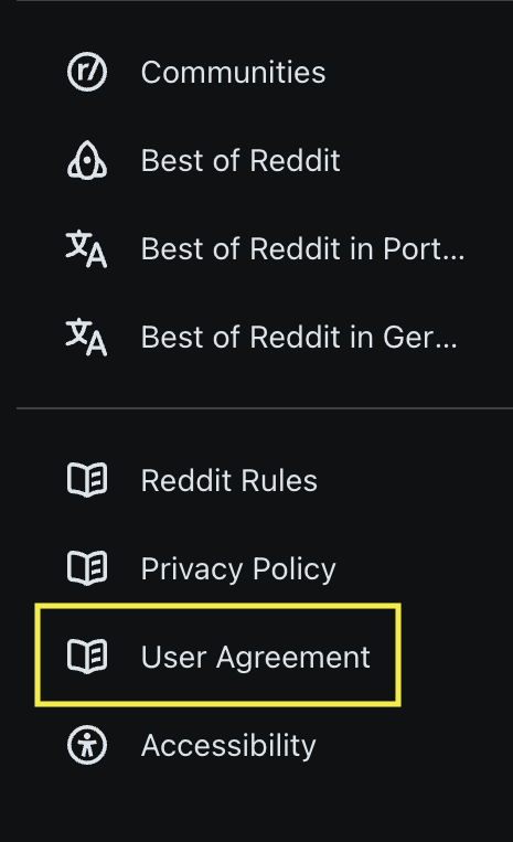 This snippet from the Reddit menu shows the User Agreement being displayed.
