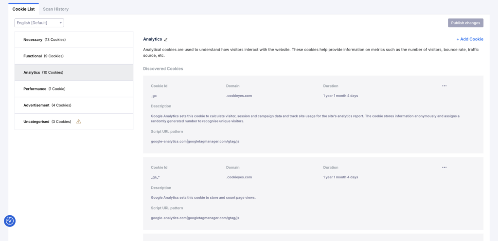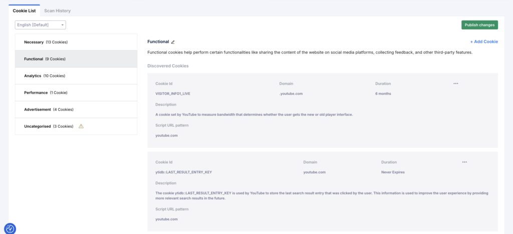 Instead of manually hunting through scripts and browser developer tools, you can scan your website using CookieYes to automatically detect cookies and trackers, categorise them, and generate a structured cookie list. The same information can then be reflected in your cookie banner and cookie policy, which makes it much easier to stay transparent and keep your consent setup aligned with what’s actually happening on your site.