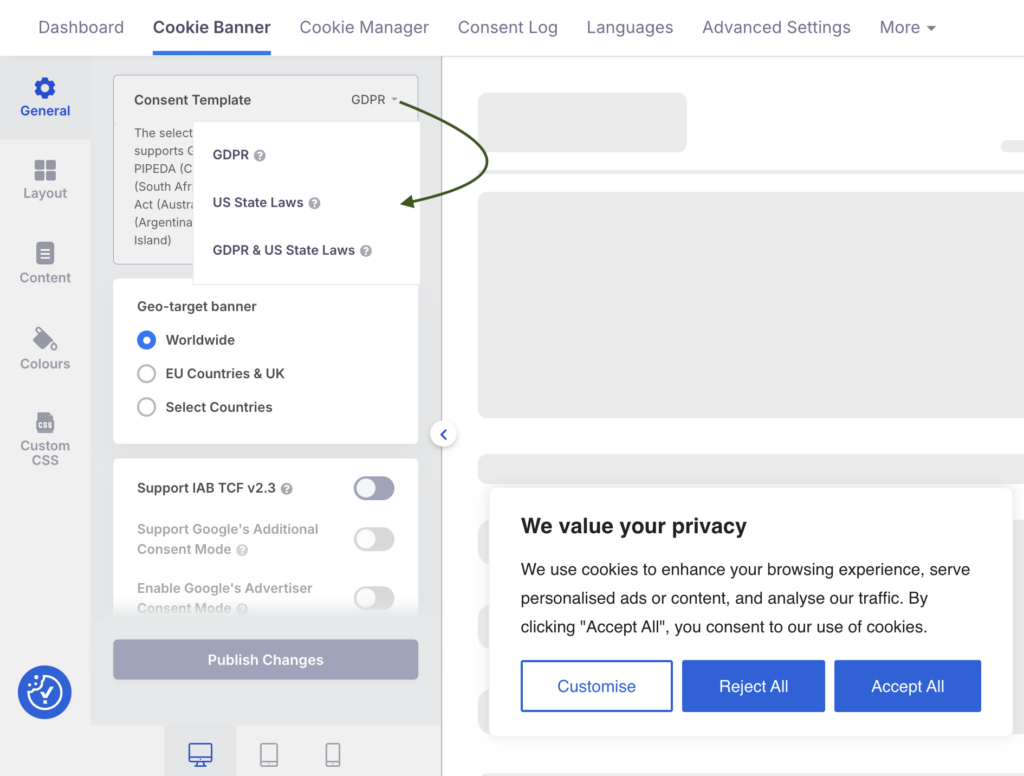 Create a cookie banner that matches the privacy requirements applicable to your website. From the Consent template dropdown, choose the option that aligns with your audience’s location, such as GDPR, US State Laws, or GDPR & US State Laws.