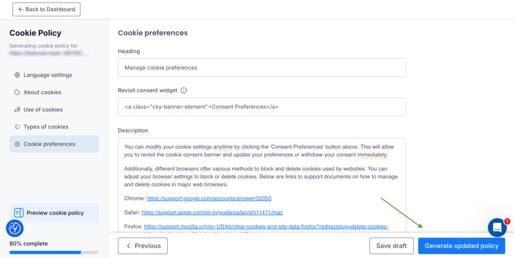 From the More dropdown on your CookieYes dashboard, open the Cookie Policy Generator to create an auto-filled cookie policy based on your website’s scan results. Click Generate button to review and publish it on your site.
