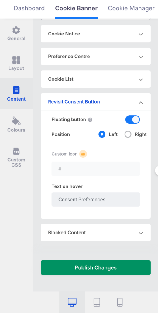 If you are a CookieYes user, this is as simple as activating the floating button toggle within the Cookie banner > Content > Revisit Consent Button.